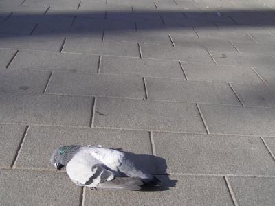 lustigerweise fahren auf dieser strasse keine autos, nur fahrräder. vielleicht ist die taube einfach nur vom baum gefallen? herzattacke? oder war opfer eines rivalitätskampfes? bin offen für weitere vorschläge...